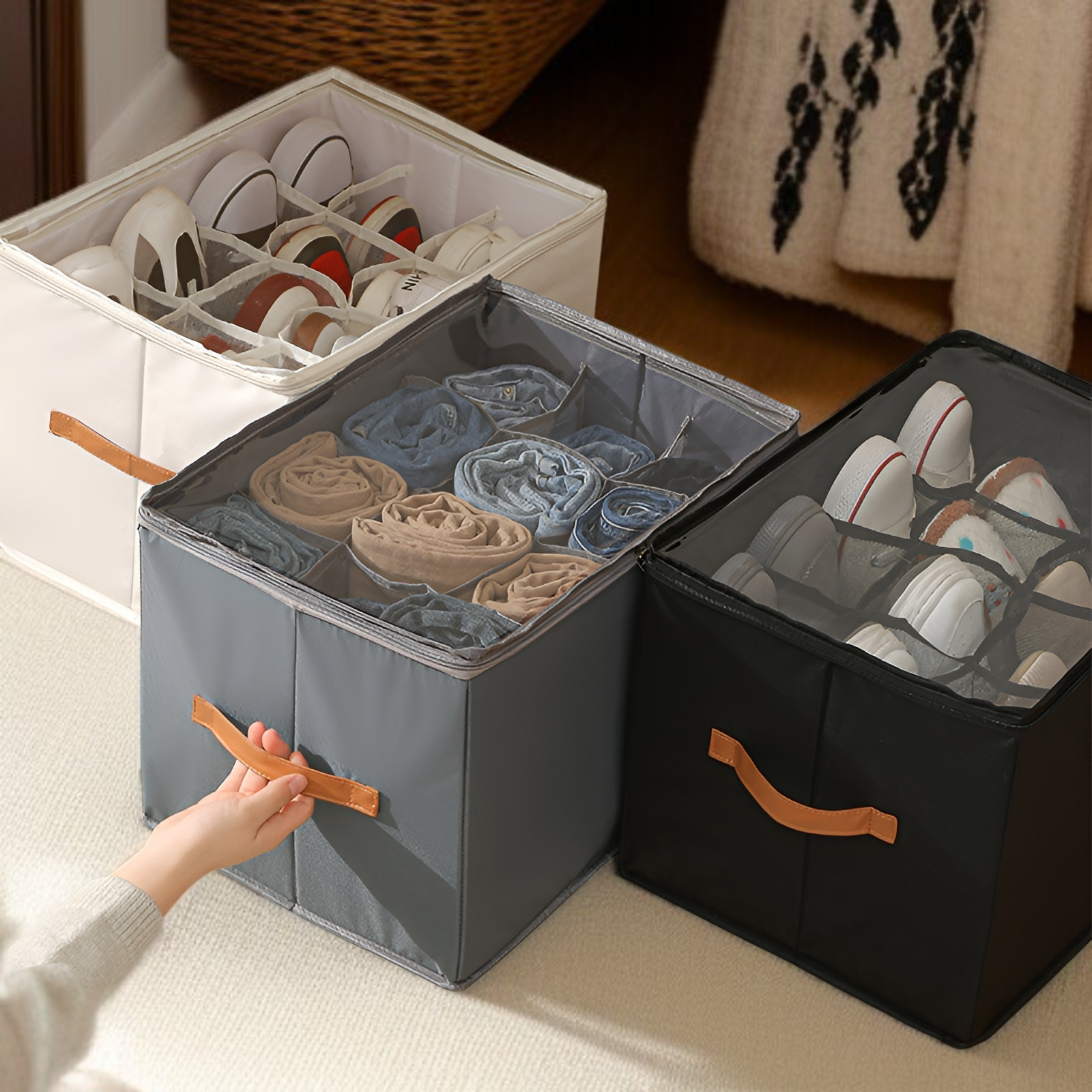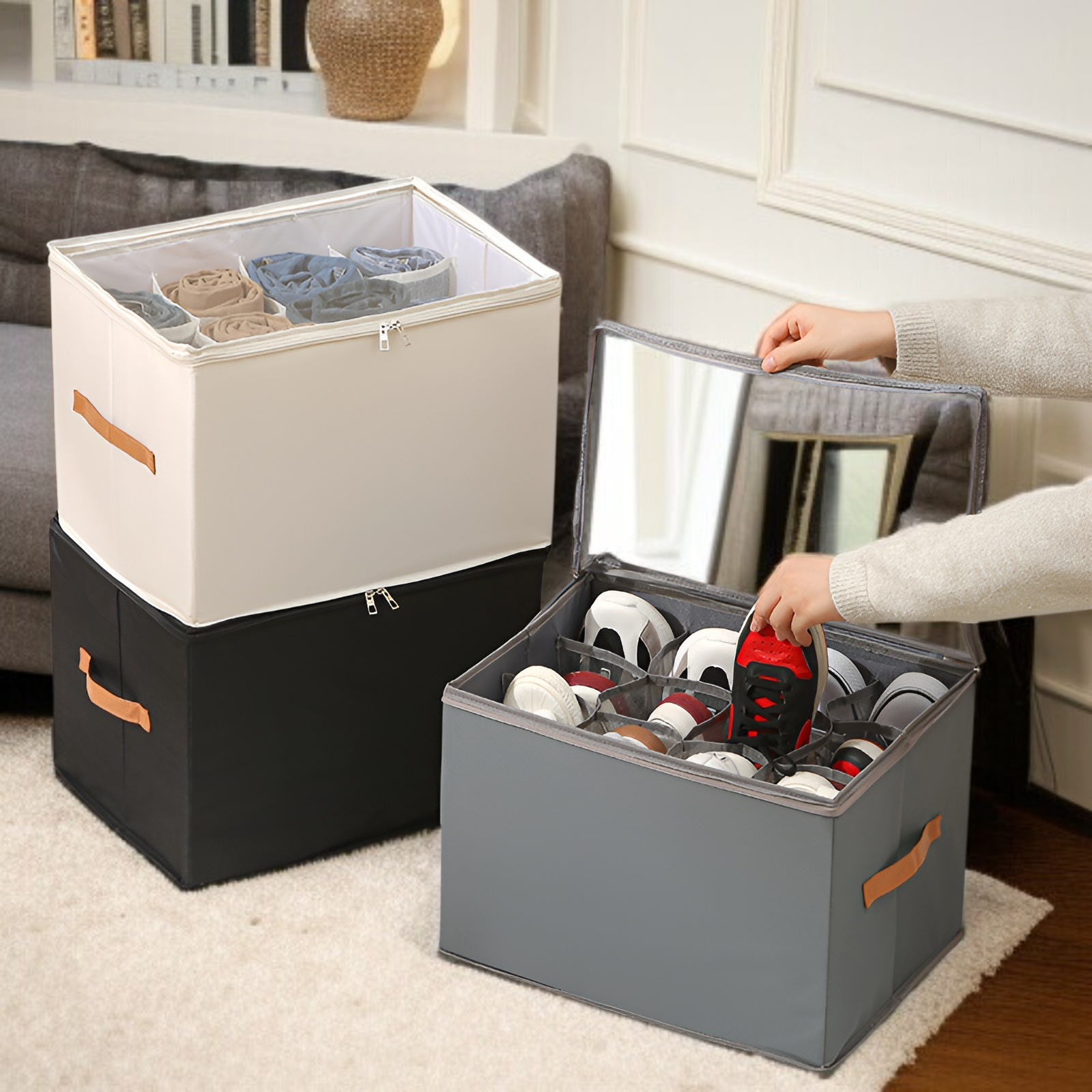 折りたたみ式カバー付き靴収納ボックス。見えるデザインで靴を簡単管理。仕切り付きで衣類や雑貨も収納可能。多機能収納でスペースを有効活用。